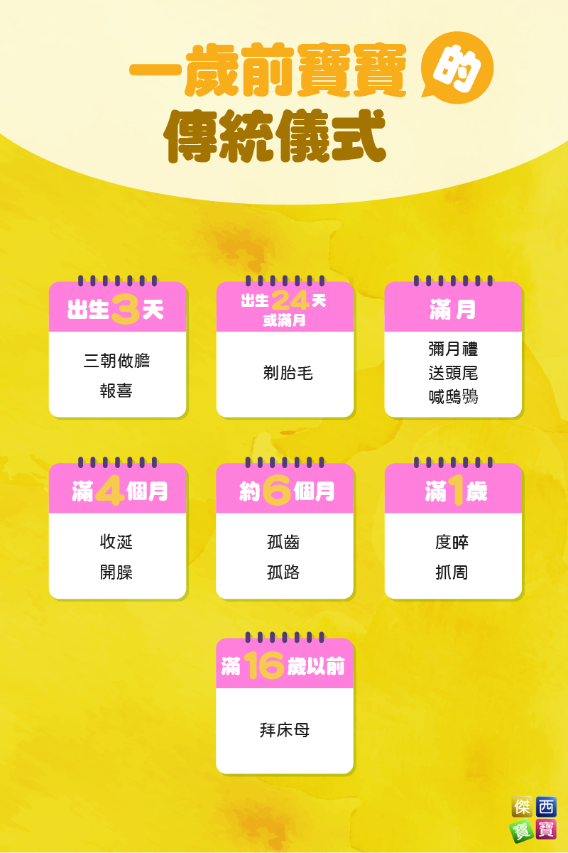 讓我們來看看,1歲以前除了有常見的滿月禮及抓周外,還有哪些特別的儀式吧!
